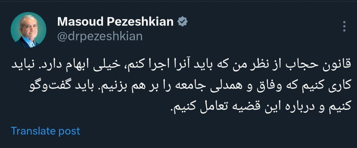 مسعود پزشکیان رئیس دولت در توییتی نوشت: «قانون حجاب از نظر من که باید آنرا اجرا کنم، خیلی ابهام دارد. نباید کاری کنیم که وفاق و همدلی جامعه را بر هم بزنیم. باید گفتوگو کنیم و درباره این قضیه تعامل کنیم.»