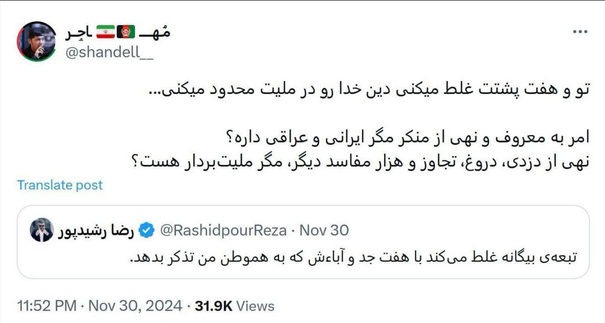 رضا رشیدپور به توئیت یک طلبه افغان نسبت قانون عفاف و حجاب پاسخ داد: