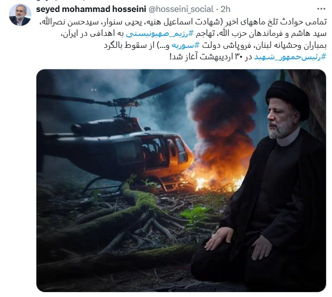 او در توئیت خود نوشت: تمامی حوادث تلخ ماههای اخیر (شهادت اسماعیل هنیه، یحیی سنوار، سید حسن نصرالله، سید هاشم و فرماندهان حزبالله، تهاجم رژیم صهیونیستی به اهدافی در ایران، بمباران وحشیانه لبنان، فروپاشی دولت سوریه و...) از سقوط بالگرد رئیسجمهور شهید در ۳۰ اردیبهشت آغاز شد!