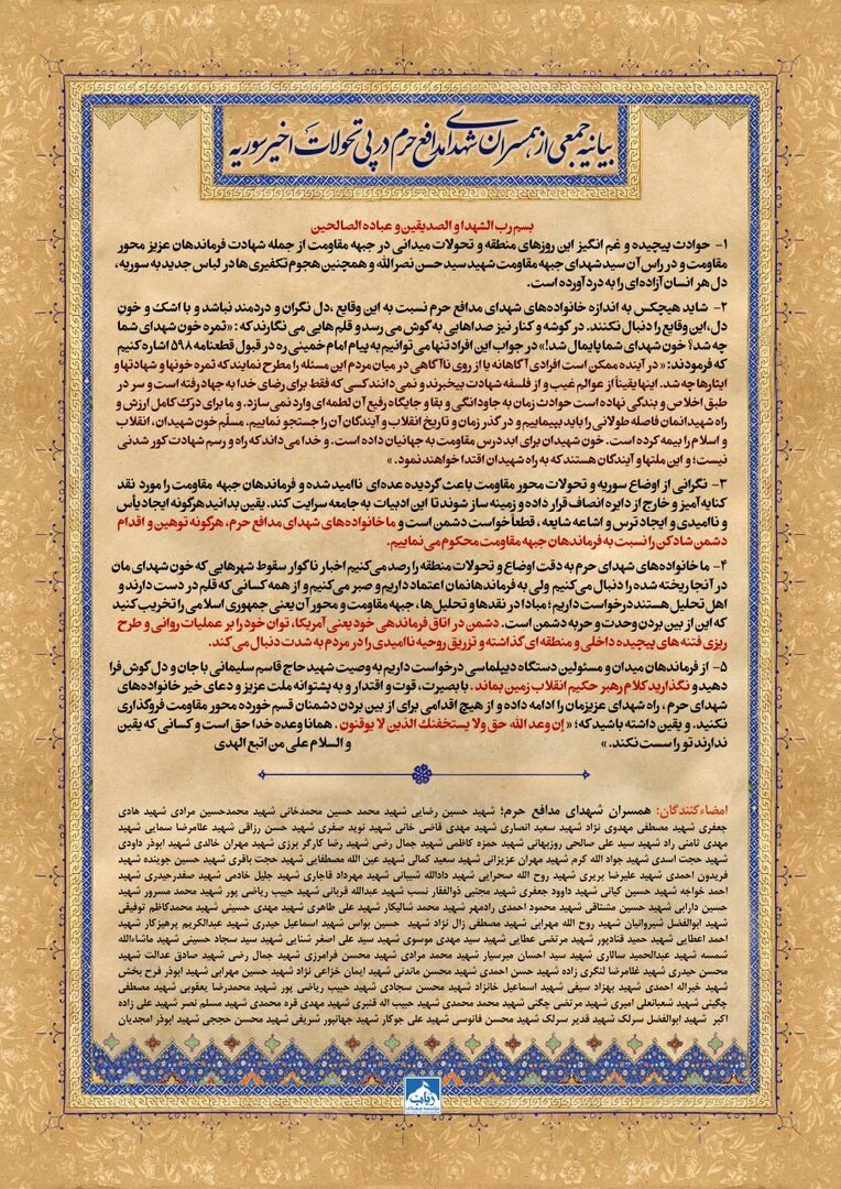 ۳- نگرانی از اوضاع سوریه و تحولات محور مقاومت باعث گردیده عدهای ناامید شده و فرماندهان جبهه مقاومت را مورد نقد کنایهآمیز و خارج از دایره انصاف قرار داده و زمینهساز شوند تا این ادبیات به جامعه سرایت کند. یقین بدانید هرگونه ایجاد یأس و ناامیدی و ایجاد ترس و اشاعه شایعه، قطعاً خواست دشمن است و ما خانوادههای شهدای مدافع حرم، هرگونه توهین و اقدام دشمن شادکن را نسبت به فرماندهان جبهه مقاومت محکوم مینماییم.