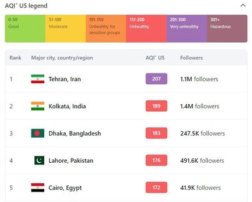 براساس اطلاعات شرکت سوئیسی IQAir، تهران درحال‌حاضر آلوده‌ترین شهر جهان محسوب می‌شود. طبق گزارش این شرکت، تهران با شاخص ۲۰۷، صدر جدول آلودگی هوا را در سرتاسر جهان از آن خود کرده است. رتبه دوم، به شهر کلکته در هند اختصاص دارد.