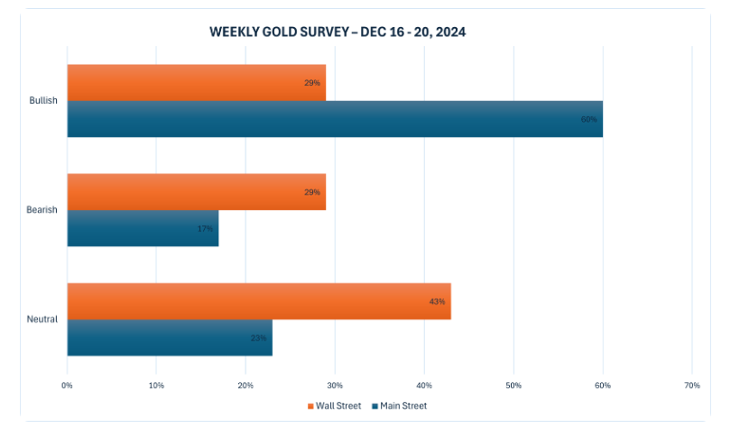 این هفته، 14 تحلیلگر در نظرسنجی Kitco News Gold شرکت کردند، در حالی که احساسات وال استریت اکنون به طور مساوی بین خوش بینان و بدبینان در مورد قیمت تقسیم شده است و بسیاری از آنها حاشیه را انتخاب می کنند. چهار کارشناس یا 29 درصد انتظار داشتند که قیمت طلا در هفته آینده افزایش یابد، در حالی که چهار کارشناس دیگر کاهش قیمت را پیش بینی کردند. شش کارشناس که 43 درصد از کل را تشکیل می‌دهند، انتظار داشتند که طلا در محدوده باقی بماند یا رویکرد انتظار و دید را انتخاب کردند.
