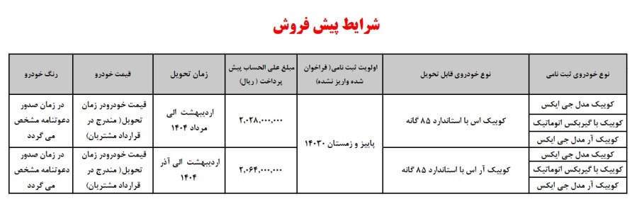 به گزارش سایت طلا، پیرو اعلام نتایج در سامانه یکپارچه تخصیص خودرو به اطلاع نمایندگی ها و متقاضیان حائز شرایطی که در طرح عادی سامانه مذکور در سال گذشته نسبت به ثبت نام اولیه خودروی کوییک مدل جی ایکس ، کوییک با گیربکس اتوماتیک و کوییک آر مدل جی ایکس اقدام نموده و در تاریخ 1403/09/29 پیامک به ایشان ارسال میگردد می رساند، امکان واریز وجه خودرو و ثبت نام از تاریخ 1403/10/01 ساعت 10:00 مطابق شرایط ذیل فراهم می گردد.