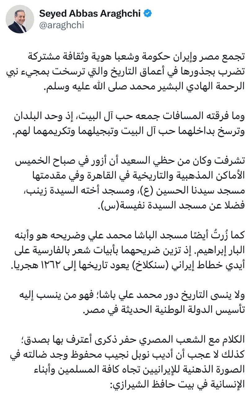 سیدعباس عراقچی وزیر امور خارجه جمهوری اسلامی ایران پیامی به زبان عربی در شبکه ایکس در خصوص بازدید از برخی اماکن تاریخی-مذهبی در قاهره منتشر کرد.