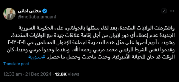 سفیر ایران در بیروت، از شرط آمریکا برای حمایت از حکام جدید سوریه خبر داد و نوشت که واشنگتن در دوران ریاستجمهوری محمد مرسی نیز این شرط را گذاشته بود.