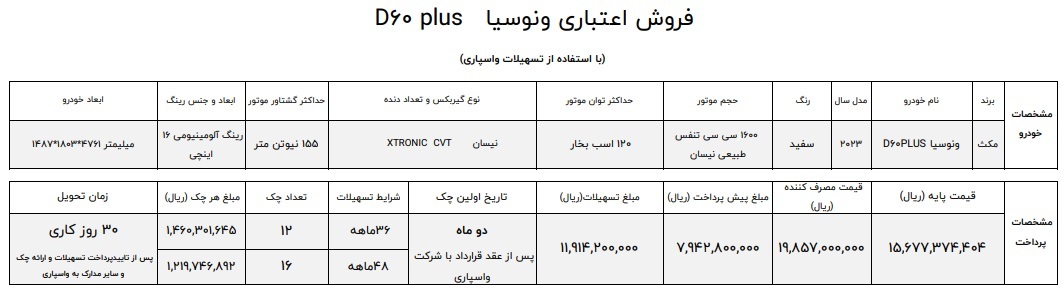 شرایط طرح فروش اقساطی خودرو ونوسیا D60 پلاس در دی 1403 اعلام شد.