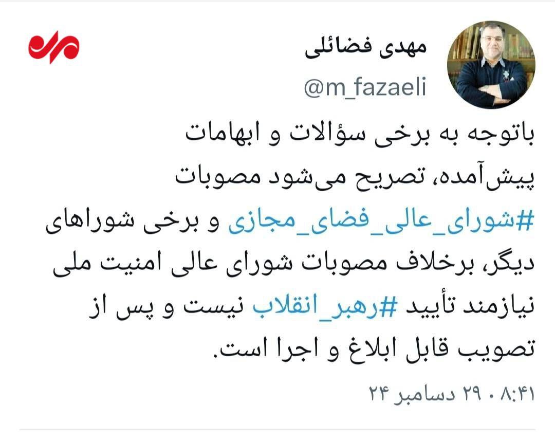 عضو دفتر حفظ و نشر آثار حضرت آیتالله خامنهای تأکید کرد که مصوبات شورای عالی فضای مجازی نیازمند تأیید رهبر انقلاب نیست و پس از تصویب قابل ابلاغ و اجراست.