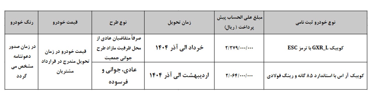 گروه خودروسازی سایپا از محل مازاد ظرفیت طرح حمایت از خانواده و جوانی جمعیت و در راستای تنظیم بازار، امکان ثبتنام خودرو کوییک GXR-L را برای متقاضیان عادی (با ظرفیت محدود) و خودرو کوییک RS با استاندارد ۸۵گانه را ویژه متقاضیان عادی، طرح حمایت از خانواده و جوانی جمعیت و جایگزینی خودروهای فرسوده را مطابق با شرایط و محدودیتهای گذشته از ساعت ۱۱ امروز دوشنبه ۱۰ دیماه ۱۴۰۳ آغاز خواهد کرد. زمان تحویل خودرو کوییک GXR-L از خرداد لغایت آذرماه ۱۴۰۴ و برای خودرو کوییک RS با استاندارد ۸۵گانه، از اردیبهشت تا آذرماه ۱۴۰۴ خواهد بود.