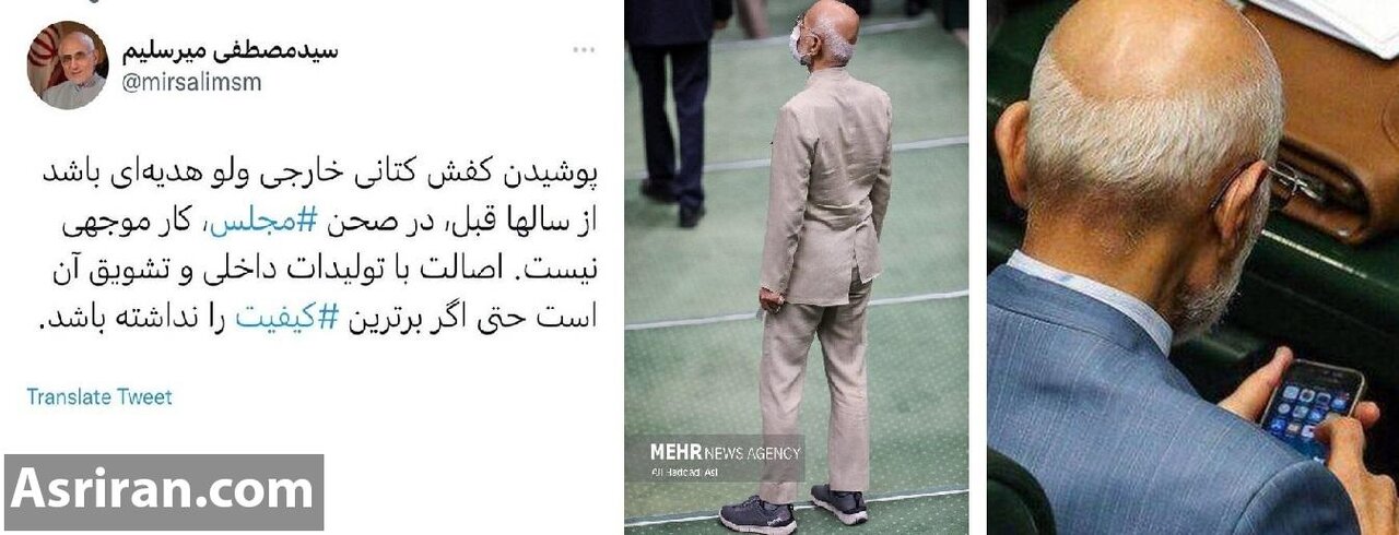 «پوشیدن کفش کتانی خارجی ولو هدیه ای باشد از سال های قبل، در صحن مجلس، کار موجهی نیست. اصالت با تولیدات داخلی و تشویق آن است حتی اگر برترین کیفیت را نداشته باشد.»