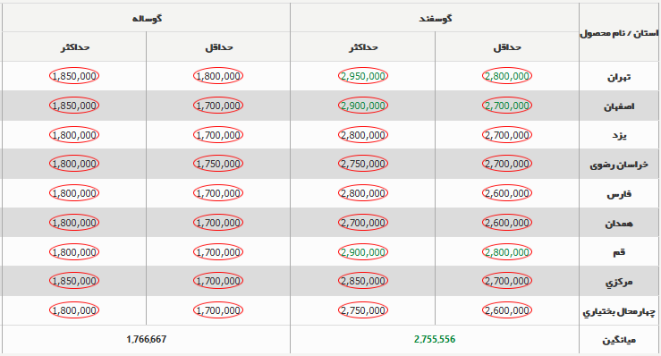 در استان خراسانرضوی قیمتها افزایشی بود؛ به طوری که هر کیلو گوسفند زنده بین ۲۷۰ تا ۲۷۵ هزار تومان و هر کیلو گوساله زنده ۱۷۵ تا ۱۸۰ هزار تومان اعلام شد. در استان فارس نیز قیمت هر کیلو گوسفند زنده ۲۶۰ تا ۲۸۰ هزار تومان و گوساله زنده ۱۷۰ تا ۱۸۰ هزار تومان است.