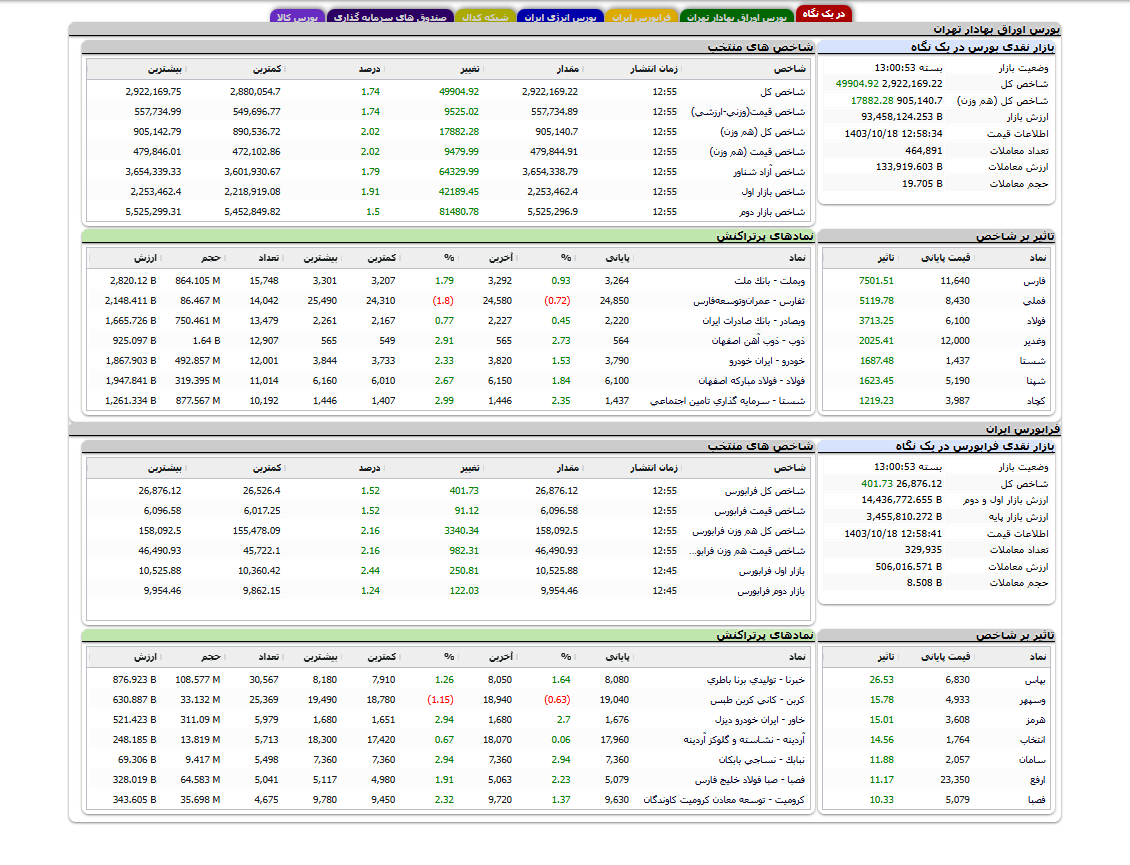 شاخص کل بورس اوراق بهادار تهران در پایان معاملات امروز (سه شنبه ۱۸ دی) بازار سهام، با ۴۹ هزار و ۹۰۵ واحد معادل یک و ۷۵ صدم درصد افزایش به دو میلیون و ۹۲۲ هزار و ۱۶۸ واحد رسید.