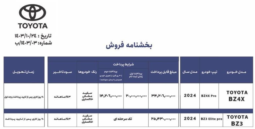 این شرکت شرایط فروش دو خودروی برقی، تویوتا BZ4X و BZ3 را با موعد تحویل 90 روز کاری اعلام کرد.