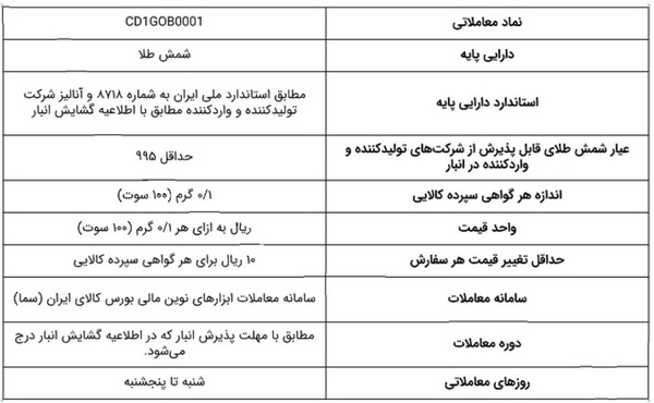 هر گواهی سپرده کالایی شمش طلا معادل ۰/۱ گرم (۱۰۰ سوت) از شمش طلای «یک کیلو گرمی» با «عیار ۹۹۵ از ۱۰۰۰» است که با نماد «CD1G0B0001» و از روز شنبه تا پنجشنبه معامله میشود.