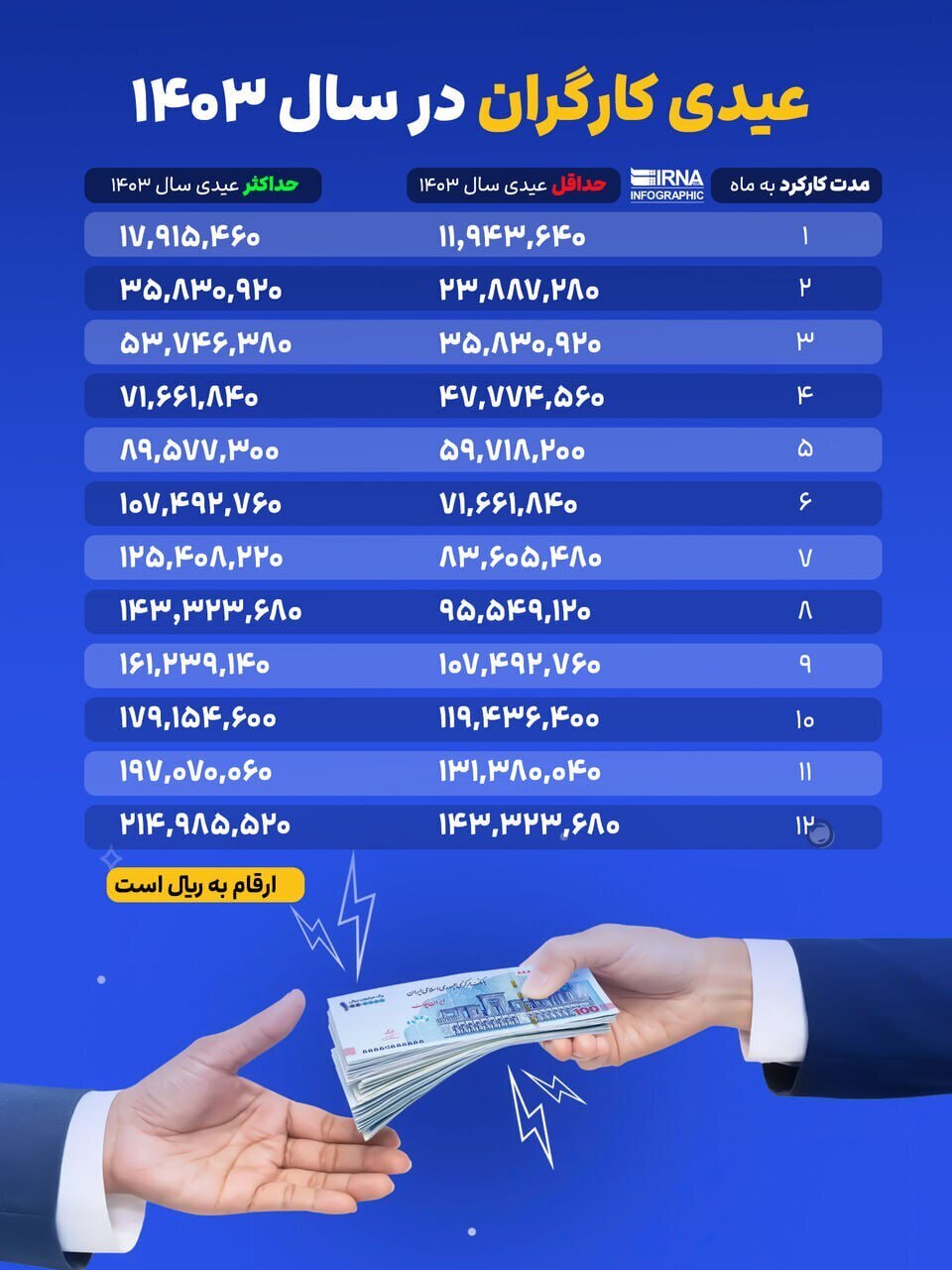 در اینفوگرافی زیر میزان عیدی کارگران بر اساس تعداد ماه کارکرد آنها در سال ۱۴۰۳ مشخص شده است.