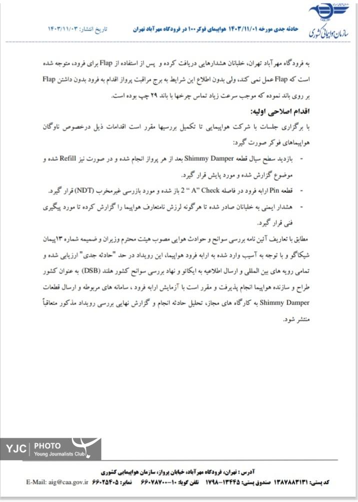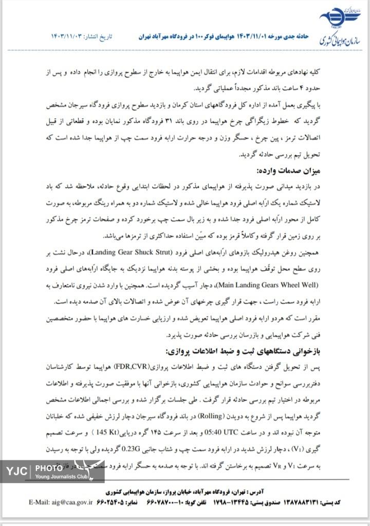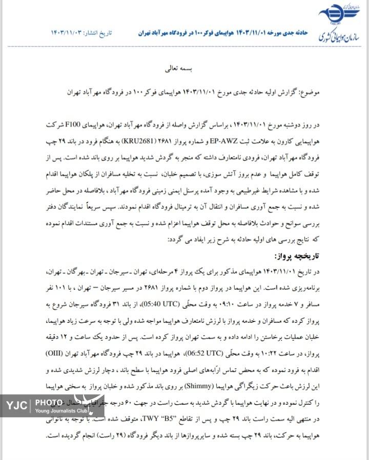 گزارش اولیه حادثه جدی هواپیمای فوکر ۱۰۰ در فرودگاه مهرآباد تهران در اول بهمن ماه اعلام شد.