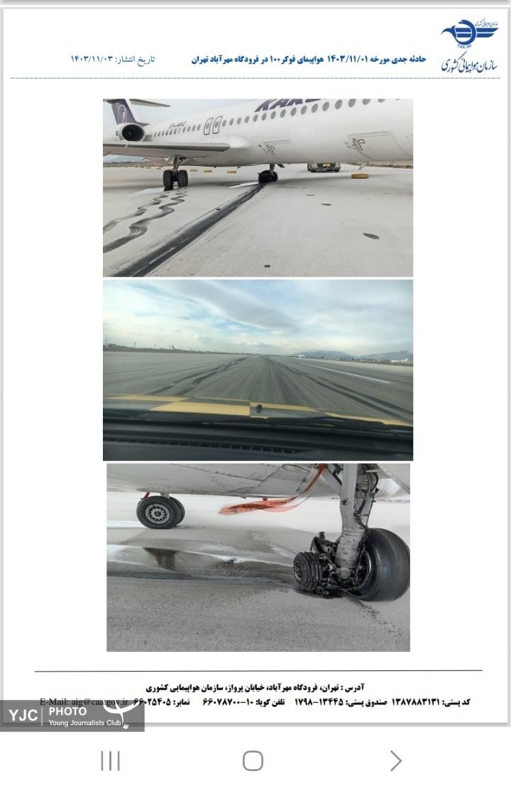علت اولیه ترکیدگی لاستیک هواپیمای فوکر ۱۰۰ در فرودگاه مهرآباد اعلام شد