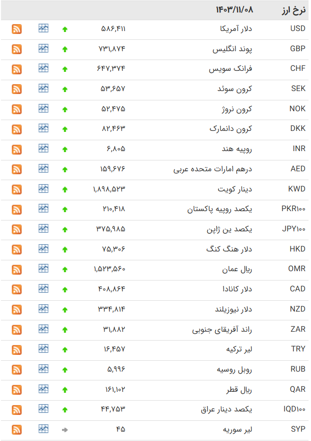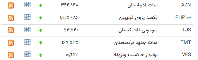 | یوان چین | CNY | ۹۳,۹۸۹ | ۹۴,۸۴۳ | -۹۳ | ۹۱,۴۲۹ | ۹۲,۲۵۹ | -۹۱ |