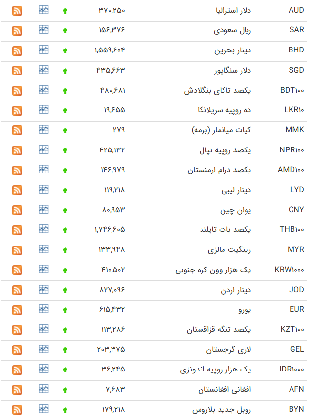 | ریال عربستان | SAR | ۱۸۱,۵۵۹ | ۱۸۳,۲۰۸ | -۱۸۱ | ۱۷۶,۶۱۴ | ۱۷۸,۲۱۸ | -۱۷۶ |