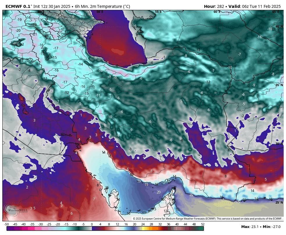 در آخرین پیش بینی های مدل های هواشناسی ریزش یک سرمای شدید به کشور برای بازه زمانی ۸ تا ۱۰ روز دیگر پیش بینی شده است که می تواند روزهای بسیار سردی را در کشور رقم بزند.
