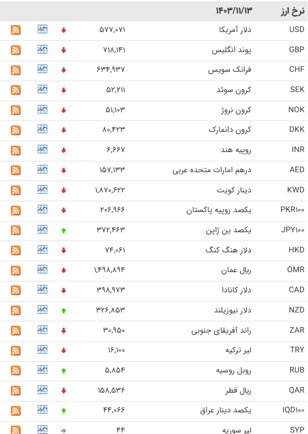 | روبل روسیه | RUB | ۶,۹۱۵ | ۶,۹۷۸ | ۴۵ | ۶,۷۲۷ | ۶,۷۸۸ | ۴۴ |