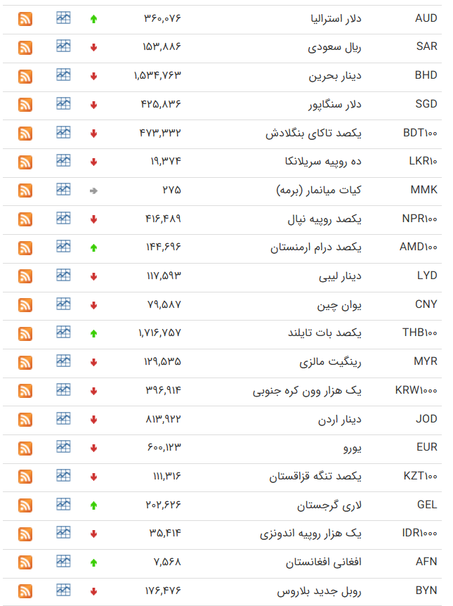 | ریال عربستان | SAR | ۱۸۱,۷۹۰ | ۱۸۳,۴۴۱ | -۴۱ | ۱۷۶,۸۳۸ | ۱۷۸,۴۴۴ | -۴۱ |