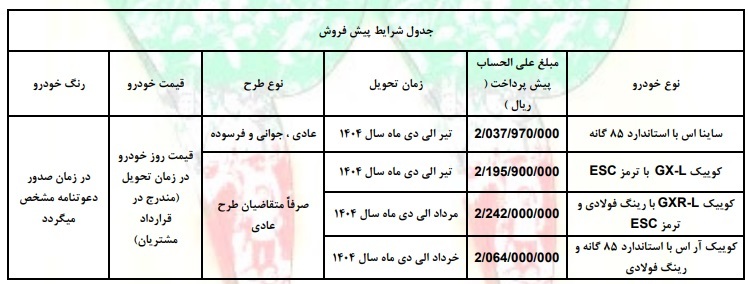 ضمن تبریک سالگرد پیروزی انقلاب اسلامی و به مناسب دهه مبارک فجر، به اطلاع نمایندگی های مجاز گروه خودرو سازی سایپا میرساند، شرایط پیش فروش محصولات شرکت سایپا و پارس خودرو به شرح ذیل در سامانه گروه خودروسازی سایپا اجرایی خواهد شد.