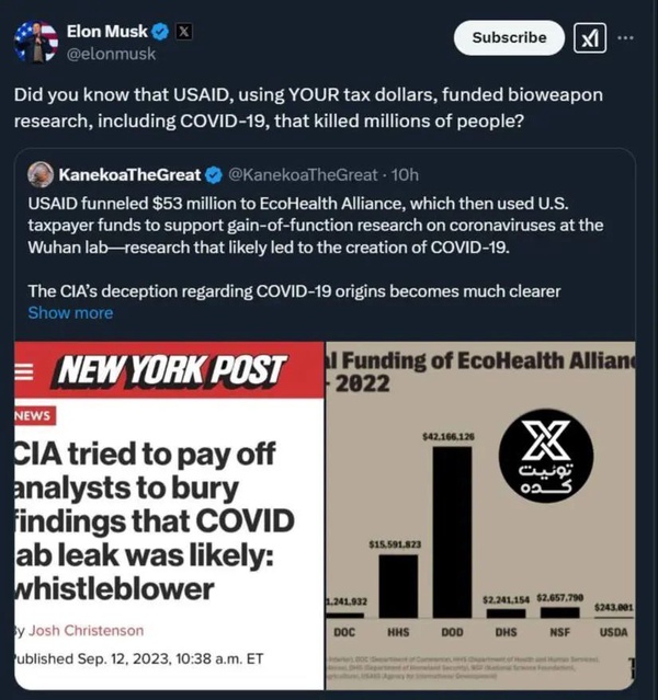 وی پس از آنکه سخنگوی کاخ سفید رسما اعلام کرد که شیوع ویروس کرونا حاصل نشت آزمایشگاهی در چین بوده، ایلان ماسک با بازنشر گزارش روزنامه نیویورک پست در ایکس نوشت : «آیا میدانستید که آژانس توسعه بینالمللی آمریکا (USAID) با استفاده از مالیاتهای شما، تحقیقات مربوط به سلاحهای بیولوژیکی، از جمله ویروس کرونا را تأمین مالی کرده است که جان میلیونها نفر را گرفته است؟»