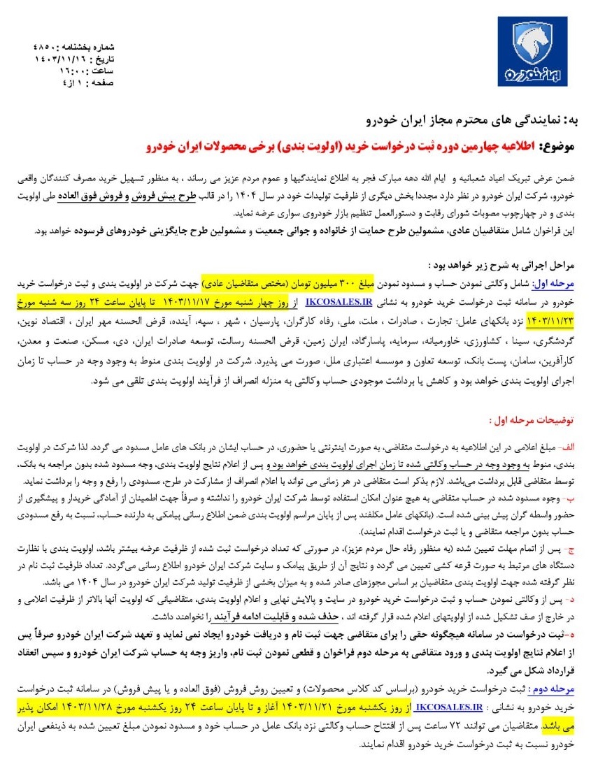 ضمن عرض تبریک اعیاد شعبانیه و ایام االله دهه مبارک فجر به اطلاع نمایندگیها و عموم مردم عزیز می رساند ، به منظور تسهیل خرید مصرف کنندگان واقعی خودرو، شرکت ایران خودرو در نظر دارد مجددا بخش دیگری از ظرفیت تولیدات خود در سال 1404 را در قالب طرح پیش فروش و فروش فوق العاده طی اولویت بندی و در چهارچوب مصوبات شورای رقابت و دستورالعمل تنظیم بازار خودروی سواری عرضه نماید.
