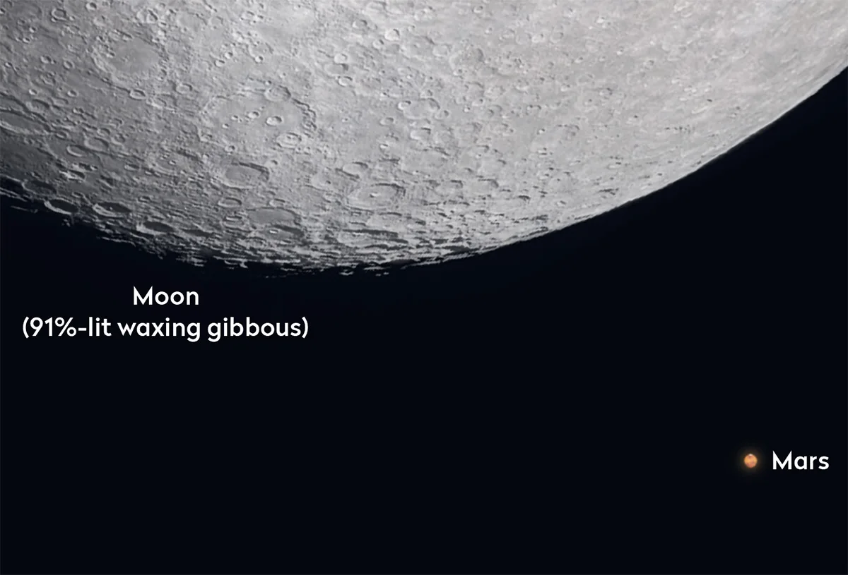 اگر بامداد روز دوشنبه در ساعت ۰۵:۲۷ به وقت ایران به آسمان نگاه کنید، می‌توانید تصویری از مریخ و ماه را در کنار هم ثبت کنید. ماه در حالت درخشان خود قرار دارد و چند روز تا ماه کامل باقی مانده است.