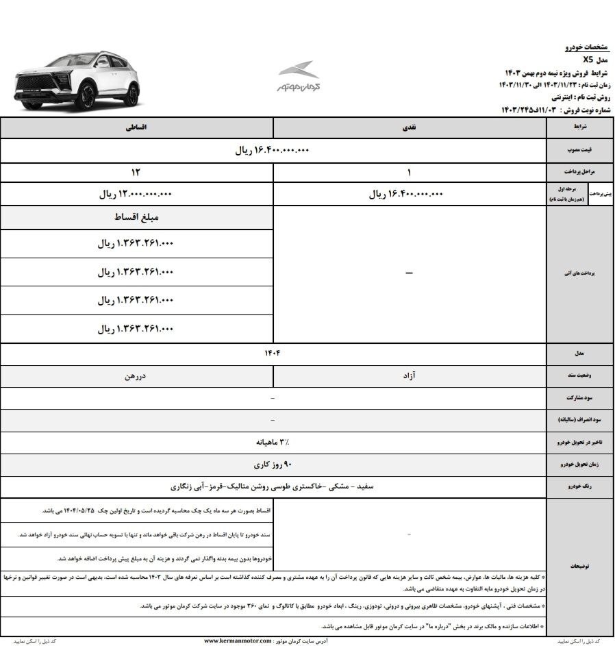ثبتنام در فروش ویژه کرمان موتور از ۲۳ بهمن ۱۴۰۳ آغاز شده و تا ۳۰ بهمن ۱۴۰۳ ادامه خواهد داشت.