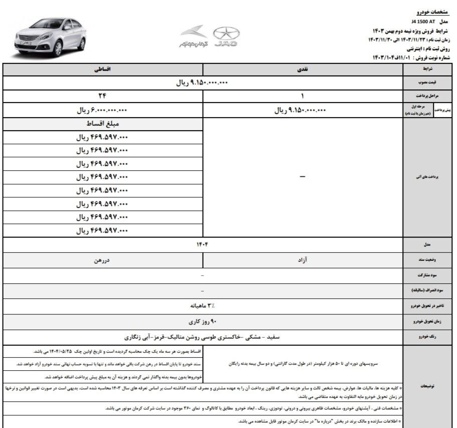 مدل J۴ ۱۵۰۰ AT نیز با قیمت نقدی ۹۱۵ میلیون تومان در این طرح فروش ویژه ارائه میشود. در طرح فروش اقساطی، پیشپرداخت برای این مدل ۶۰۰ میلیون تومان تعیین شده است و اقساط ماهانه به مبلغ ۴۶ میلیون و ۹۵۹ هزار تومان خواهد بود. اولین چک برای این مدل نیز در تاریخ ۲۵ مرداد ۱۴۰۴ باید پرداخت شود و اقساط بهصورت هر سه ماه یکبار دریافت خواهد شد.