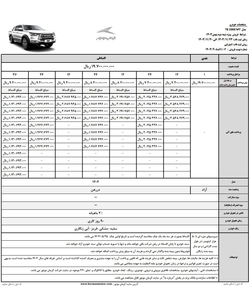مدل T۸ ۲۰۰۰MT با قیمت نقدی ۱ میلیارد و ۹۷۰ میلیون تومان در این طرح به فروش میرسد. برای فروش اقساطی این مدل، پیشپرداخت ۷۲۰ میلیون تومان تعیین شده است و گزینههای اقساط ۱۲ ماهه و ۲۴ ماهه در دسترس هستند. در طرح اقساطی، پیشپرداختهای دیگری به مبلغ ۸۲۰ میلیون تومان و ۹۲۰ میلیون تومان نیز موجود است. اولین چک برای این مدل نیز در تاریخ ۲۵ مرداد ۱۴۰۴ باید پرداخت شود.