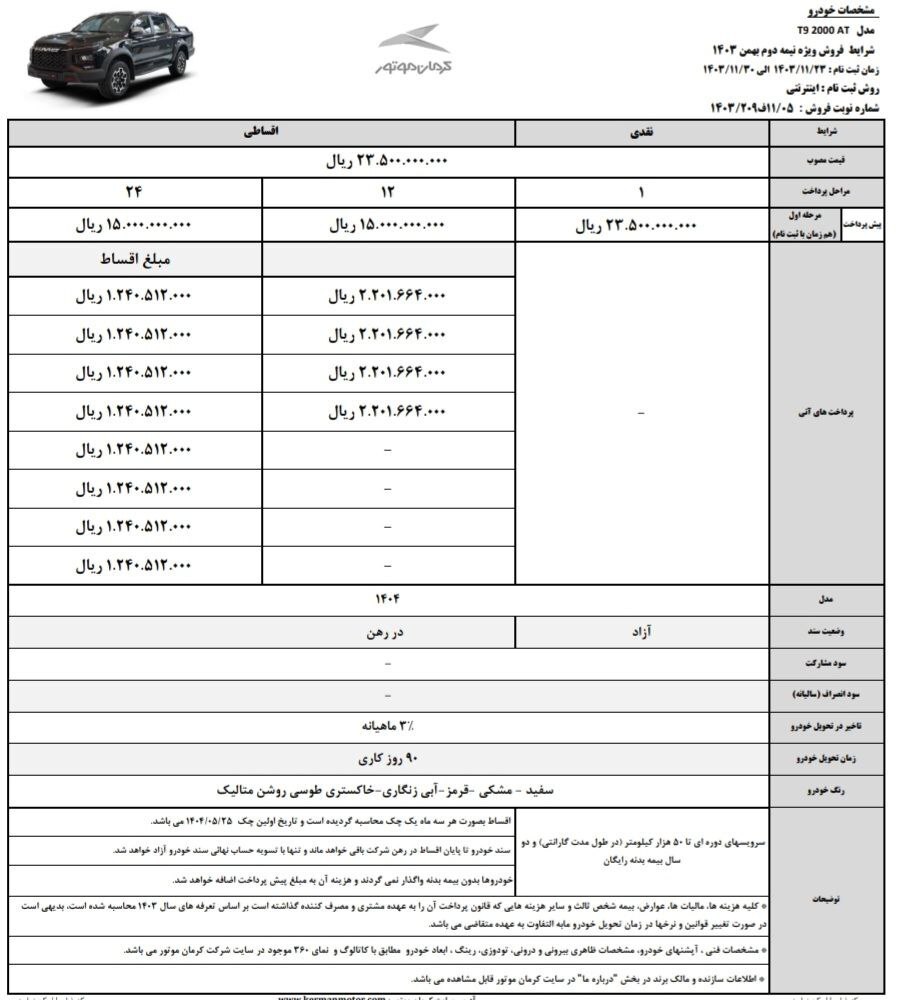 موعد تحویل خودروها در فروش ویژه کرمان موتور بهمن ۱۴۰۳