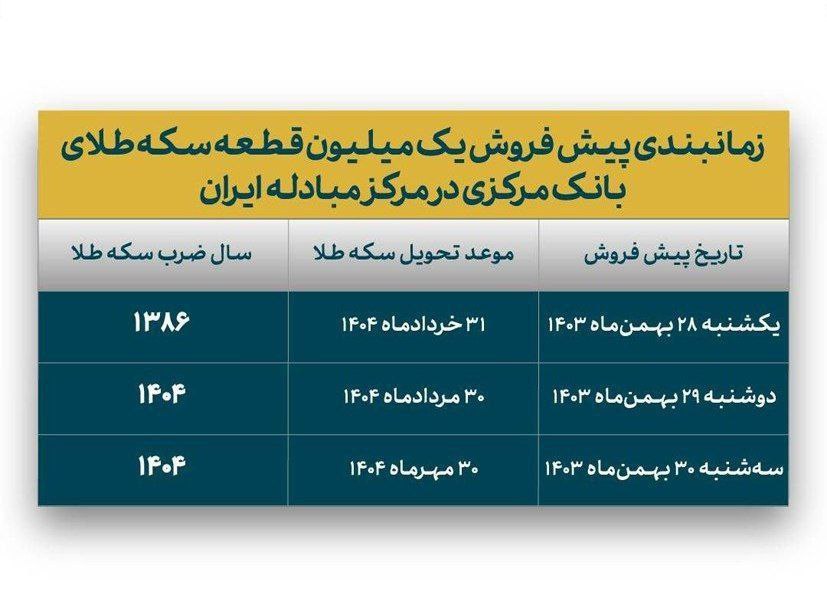 وی افزود: در پیش فروش روز یکشنبه (۲۸ بهمن) با موعد تحویل ۳۱ خردادماه ۱۴۰۴، انواع سکه ضرب ۱۳۸۶ به فروش میرسد. همچنین در پیش فروش روز دوشنبه ( ۲۹ بهمن) با موعد تحویل ۳۰ مردادماه ۱۴۰۴، انواع سکه ضرب ۱۴۰۴ به فروش خواهد رسید.