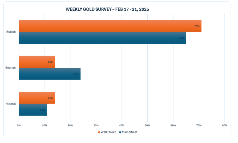 در این هفته، 14 تحلیلگر در نظرسنجی Kitco News Gold شرکت کردند و احساسات صعودی وال استریت پس از چند هفته حضور در استراتوسفر به زمین بازگشت. 10 کارشناس یا 71 درصد انتظار دارند که قیمت طلا در هفته آینده افزایش یابد، در حالی که دو تحلیلگر معادل 14 درصد کاهش قیمت این فلز گرانبها و دو نفر دیگر شاهد تثبیت طلا در هفته آینده بودند.