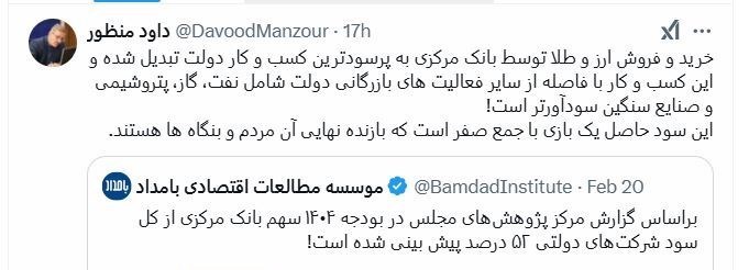 داود منظور رئیس سابق سازمان برنامه و بودجه با اشاره به فروش سکه توسط بانک مرکزی نوشت: خریدوفروش ارز و طلا توسط بانک مرکزی به پرسودترین کسبوکار دولت تبدیل شده است و این کسبوکار با فاصله از سایر فعالیتهای بازرگانی دولت شامل نفت، گاز، پتروشیمی و صنایع سنگین سودآورتر است، این سود حاصل یک بازی با جمع صفر است که بازنده نهایی آن مردم و بنگاهها هستند.
