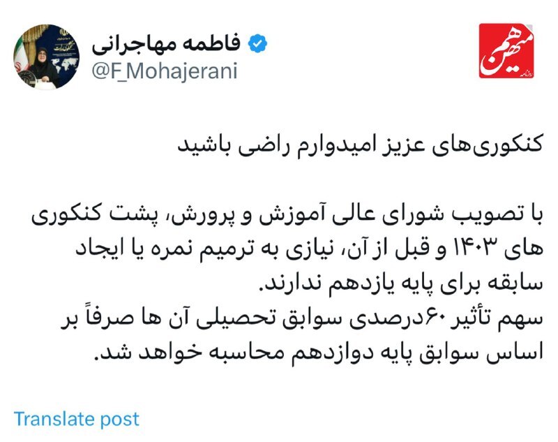 سخنگوی دولت با انتشار پیامی در شبکه اجتماعی ایکس از مصوبه جدید شورای عالی آموزش و پرورش درباره کنکور خبر داد.