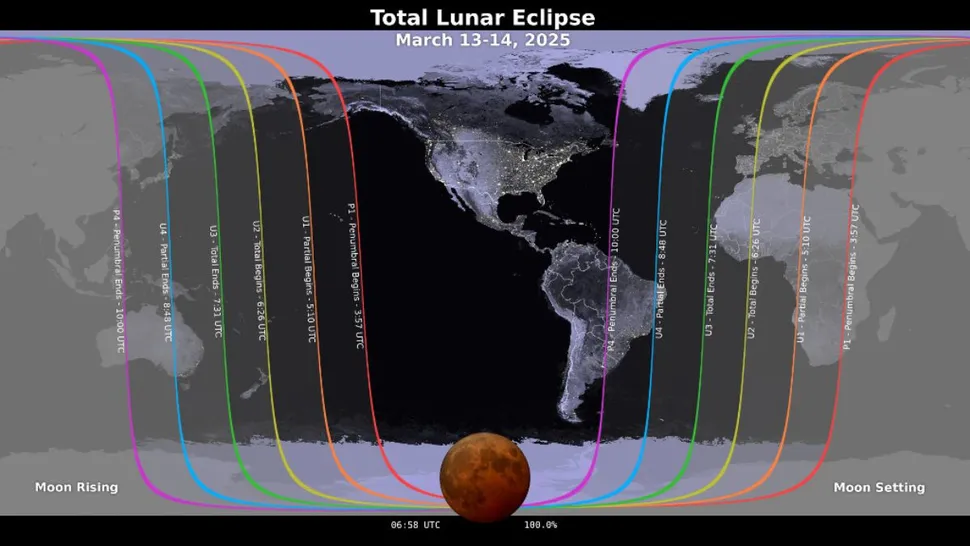 ماه گرفتگی کامل در روزهای ۱۳ و ۱۴ مارس سال ۲۰۲۵ (۲۳ و ۲۴ اسفند) در سراسر نیمه شب زمین قابل مشاهده خواهد بود.