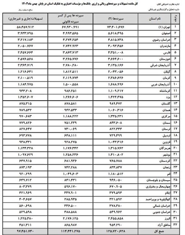 در خصوص تسهیلات جاری و غیرجاری، مانده کلی تسهیلات (شامل جاری و غیرجاری) شبکه بانکی در ۳۱ استان و مناطق آزاد در ۱۱ ماهه سال جاری تا پایان بهمن ماه به رقم ۹۷۴۵ هزار میلیارد تومان رسیده است؛ که بیشترین این مبلغ در استان تهران با ۵۸۴۵ هزار میلیارد تومان و کمترین آن در استان کهگیلویه و بویراحمد با ۴۰.۴ هزار میلیارد تومان مشاهده میشود.