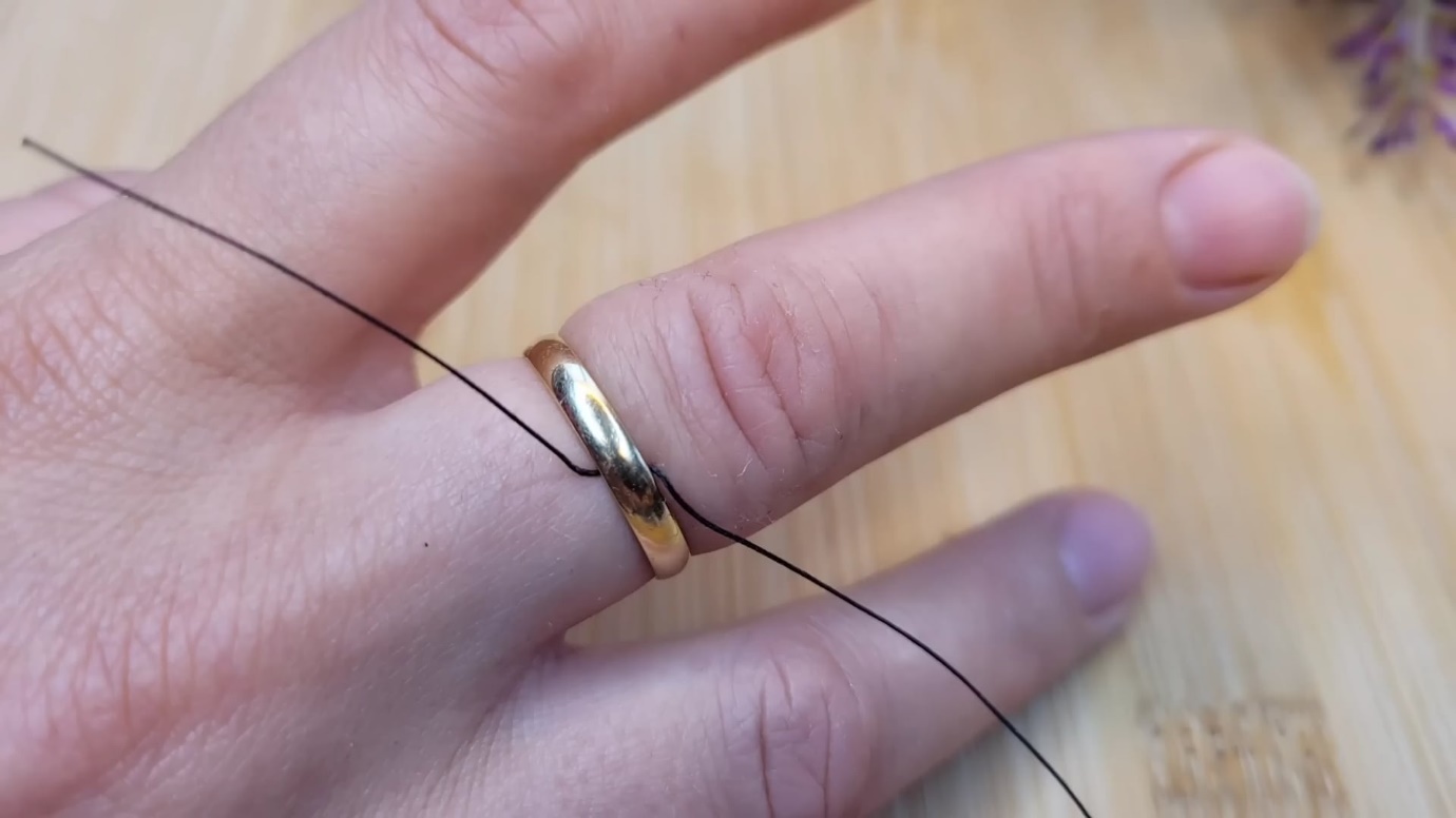 قسمت بلند نخ را دور انگشت، از پایین انگشتر تا نوک انگشت بپیچید.