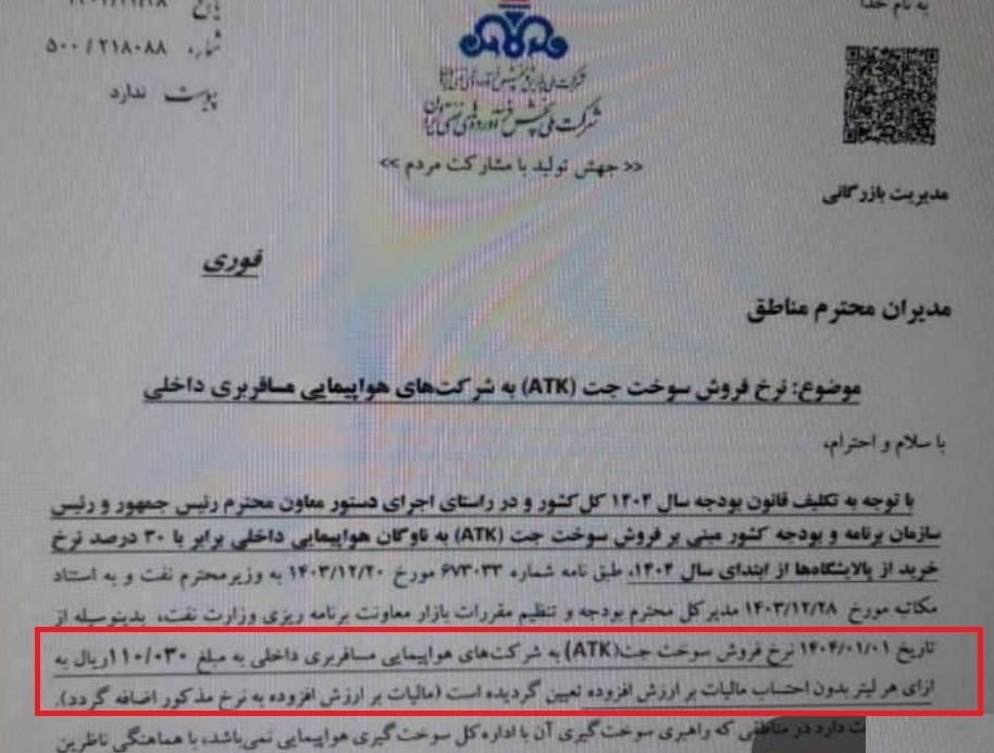 بر اساس بخشنامه شرکت ملی پالایش و پخش فرآوردههای نفتی، از تاریخ اول فروردین ماه 1404، نرخ هر لیتر سوخت هواپیما برای شرکتهای هواپیمایی کشور از 600 تومان به 110,030 ریال افزایش خواهد یافت که این مبلغ شامل مالیات بر ارزش افزوده نمیشود.