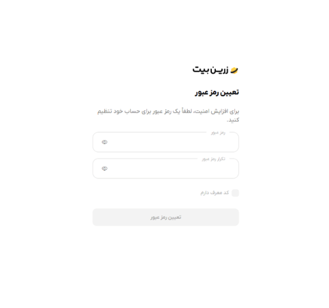 تعیین رمز عبور: بعد از درج کدی که به شما پیامک میشود، باید رمز عبور و کد معرف (در صورت وجود) را وارد کنید. رمز عبور شما باید ترکیبی از حروف (کوچک و بزرگ)، علائم و اعداد باشد.
