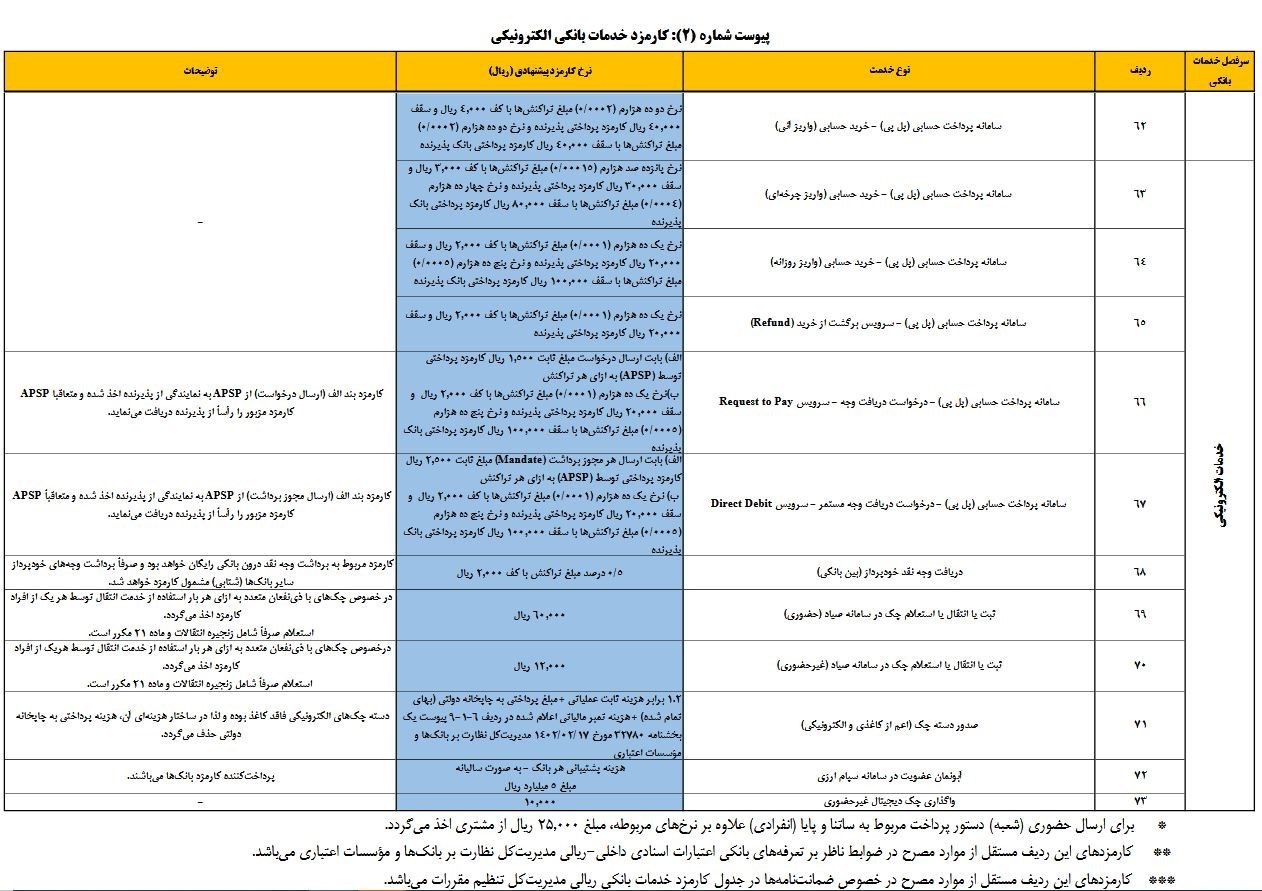 در این رابطه شایان ذکر است، بازنگری کارمزدهای خدمات بانکی ریالی و الکترونیکی پس از سپری شدن دو سال از آخرین بخشنامه ابلاغی (بخشنامه شماره 32780/02 مورخ 17/02/1402) و با ملحوظ نظر قرار دادن شرایط کلان اقتصادی و مقتضیات کنونی کشور انجام شده است؛ به نحوی که کارمزدهای مندرج در جداول پیوست بخشنامه حاضر نسبت به بهای تمام شده ارایه خدمات متناظر آنها، پایینتر و در برخی ردیفهای خدمتی نیز فاقد هرگونه تغییر میباشد. همچنین با عنایت به موارد فوق، تلاش گردیده است فرآیند تعیین کارمزد جهت جبران و پوشش ارائه برخی دیگر از خدمات بانکی ریالی و الکترونیکی به شکل تدریجی انجام شود. همچنین، کارمزدهای یاد شده از تاریخ ابلاغ لازمالاجرا بوده و تأکید میگردد مطالبه و دریافت هرگونه وجه دیگری تحت عنوان کارمزد خدمات بانکی ریالی و الکترونیکی خارج از مفاد بخشنامههای ابلاغی بانک مرکزی مجاز نمیباشد.