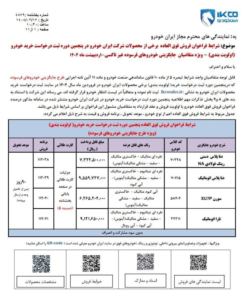 شرکت ایران‌خودرو در بخشنامه شماره ۴۸۷۹ مورخ ۱۴۰۱/۰۲/۱۷ شرایط فروش فوق‌العاده محصولات خود در پنجمین دوره ثبت‌نام را اعلام کرد. این طرح با اولویت متقاضیانی اجرا می‌شود که قصد جایگزینی خودروهای فرسوده غیرتاکسی را دارند.