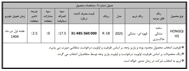 طلاع عاملیت ها و متقاضیان گرامی می رساند ، امکان ثبت نام نقدی و تحویل فوری خودروی HONGQI H۵ از محصولات وارداتی BM CARS با قیمت قطعی و ظرفیت محدود ، به صورت آنلاین از ساعت ۱۰:۰۰ صبح امروز پنج شنبه مورخ ۱۴۰۴/۰۲/۱۸ لغایت ساعت ۲۴: ۰۰ روز شنبه مورخ ۱۴۰۴/۰۲/۲۰ یا تا زمان تکمیل ظرفیت به شرح جدول ذیل فراهم می گردد.