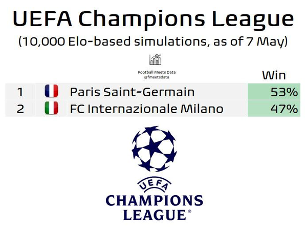 سایت «فوتبال متا دیتا» دیگر رسانه آماری هم در نظرسنجی خود درباره پیش بینی قهرمان لیگ قهرمانان، شانس پاریس را ۵۳ درصد و شانس اینتر را ۴۷ درصد می‌داند.