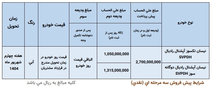 به اطلاع مشتریان محترم و نمایندگی های مجاز گروه خودروسازی سایپا می رساند، شرایط پیش فروش نقدی سه مرحله ای محصولات زامیاد از ساعت 10 صبح روز دوشنبه مورخ 1404/03/12 از طریق سایت فروش اینترنتی تا زمان تکمیل ظرفیت، طبق مراحل ذیل جاری خواهد شد.