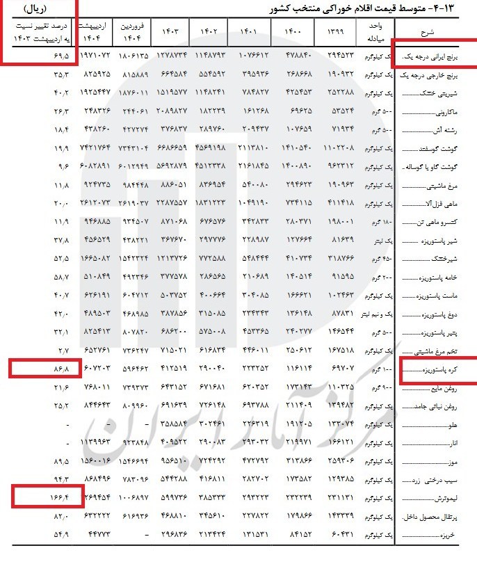 همانطور که در جدول زیر دیده میشود برنج ایرانی نسبت به اردیبهشت سال قبل حدود ۶۹ درصد افزایش قیمت داشته است. برنج خارجی نیز ۳۵ درصد گران شده است. کره پاستوریزه نیز ۸۶ درصد گران شده است.