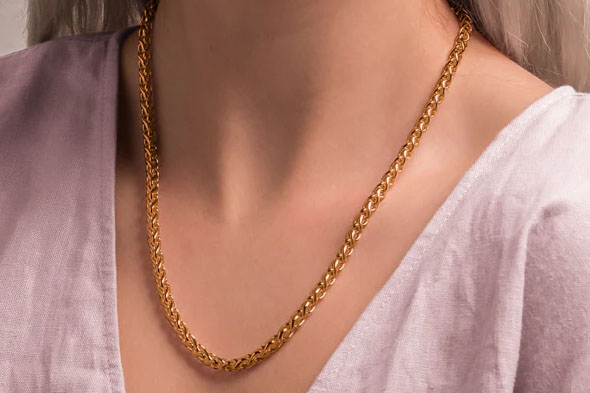 زنجیرهای گندمی دارای حلقههای بیضی شکل هستند که به طور پیچیدهای در الگویی شبیه ساقههای گندم به هم بافته شدهاند. الگوی بافته شده، سطحی بافتدار ایجاد میکند که به زنجیر عمق و جذابیت بصری میبخشد که با وجود طراحی پیچیدهشان، اغلب انعطافپذیر و روان هستند و به آنها اجازه میدهند به راحتی دور گردن یا مچ دست قرار گیرند. این مدل حس ظرافت و پیچیدگی را القا میکنند و آنها را برای مناسبتهای غیررسمی و رسمی مناسب میکنند.