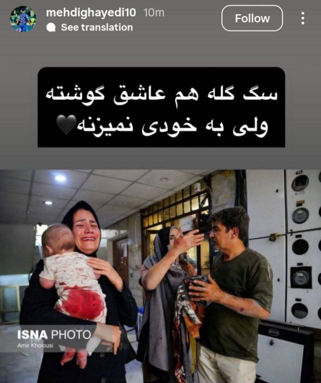 مهدی قایدی بازیکن تیم ملی فوتبال نسبت به خرابکاریهای وطنفروشان در راستای جنایات رژیم صهیونیستی در صفحه شخصیاش واکنش نشان داد و نوشت: «سگ گله هم عاشق گوشته، ولی به خودی نمیزنه!»